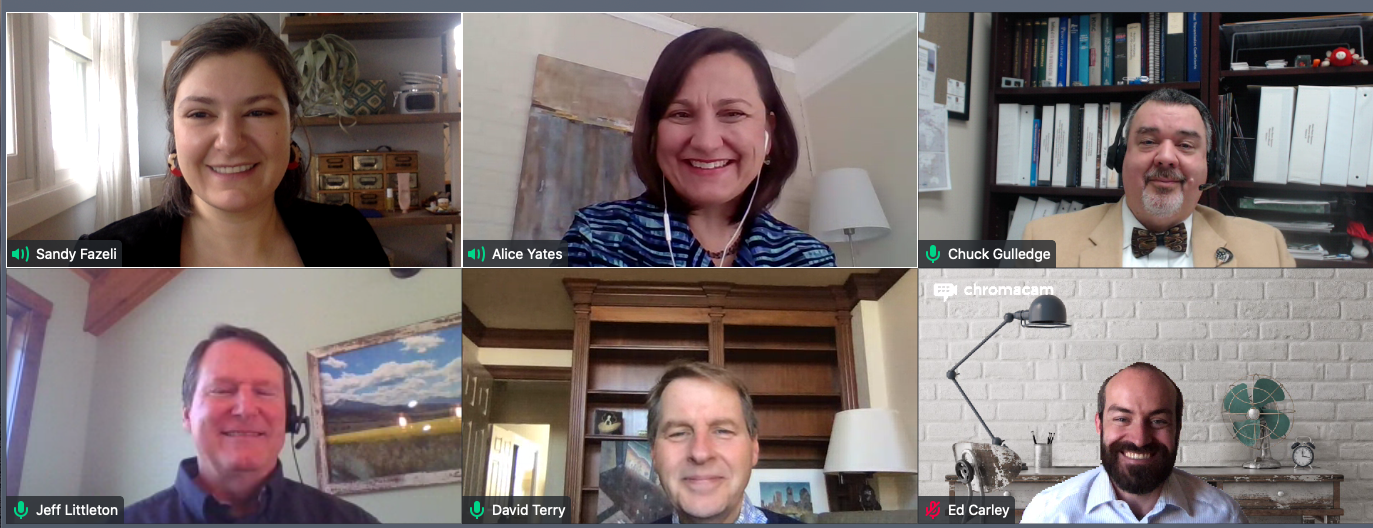 Participants in the virtual MOU signing event included (pictured clockwise from top left): Sandy Fazeli, Managing Director of Policy and Development, NASEO; Alice Yates, Director of Government Affairs, ASHRAE; Charles Gulledge, ASHRAE; Jeff Littleton, Executive Vice President, ASHRAE; David Terry, NASEO; and Ed Carley, Buildings Program Director, NASEO.