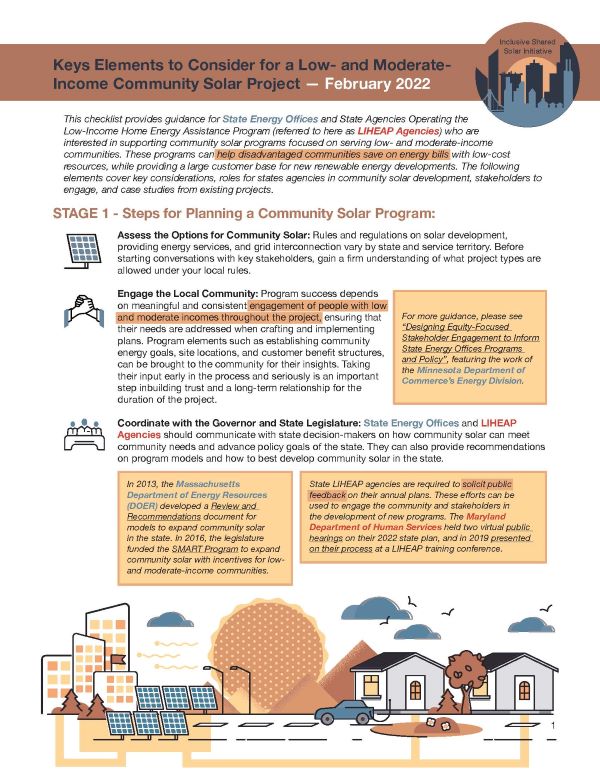 The National Association of State Energy Officials (NASEO) and the National Energy Assistance Directors Association (NEADA) have released a new resource, Key Elements to Consider for a Low- and Moderate-Income Community Solar Project, a checklist that details key steps and considerations for State Energy Offices and State Low Income Home Energy Assistance Program (LIHEAP) Offices interested in supporting the development of community solar projects that are accessible to lower-income communities and households. It offers guidance for program planning, financing and identifying sites for projects, supporting and protecting customers, and tracking progress; additionally, it emphasizes the importance of continued stakeholder engagement to elevate the priorities and needs of target communities.