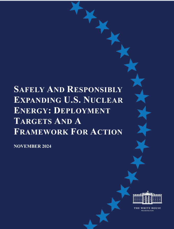 On November 12, 2024, the White House released a plan to increase deployment of new nuclear energy in the U.S. The framework, Safely and Responsibly Expanding U.S. Nuclear Energy: Deployment Targets and A Framework for Action outlines nine pathways for expanding domestic nuclear energy production in the U.S. These actions are (1) building new large, gigawatt-scale reactors; (2) building small modular reactors; (3) building microreactors; (4) extending and expanding existing reactors; (5) improving licensing and permitting; (6) developing the workforce; (7) developing component supply chains; (8) developing fuel cycle supply chains; and (8) managing spent nuclear fuel. To fully explore these different pathways, the framework lays out more than 30 actions the U.S. government can take within statutory authorities and in partnership with states, Tribes, industry, consumers, and other key stakeholders. The framework specifically references the importance of the U.S. government increasing engagement with State Energy Offices, Public Utility Commissions, and Governor’s Offices.